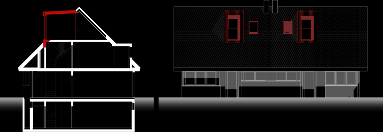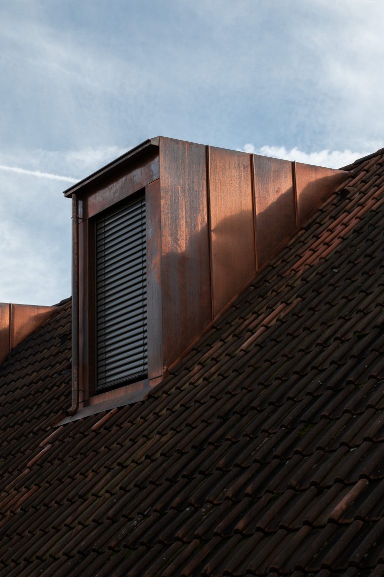 Um den Raum im Dachstock des Doppeleinfamilienhauses nutzen zu können, wurden verschiedene Varianten planerisch geprüft und mit dem Auftraggeber besprochen. Die Wahl fiel auf den Ausbau einer Lukarne je Haushälfte. Nach frühzeitiger Absprache mit der Ortsbildkommission in Riehen wurde die dazugehörige Baueingabe ohne Rückfragen genehmigt.