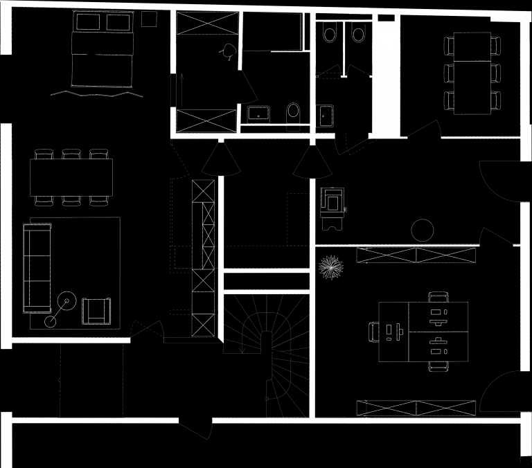 Das Spannende dabei war der Wunsch des Bauherrn, dass die beiden Einheiten einzeln, aber auch zusammengeschaltet funktionieren sollten. Dahinter stand die Idee, Wohnen und Arbeiten an einem Ort zu vereinen, nur getrennt durch eine Tür. Trotzdem sollte es möglich bleiben, beide Einheiten auch separat voneinander vermieten zu können.